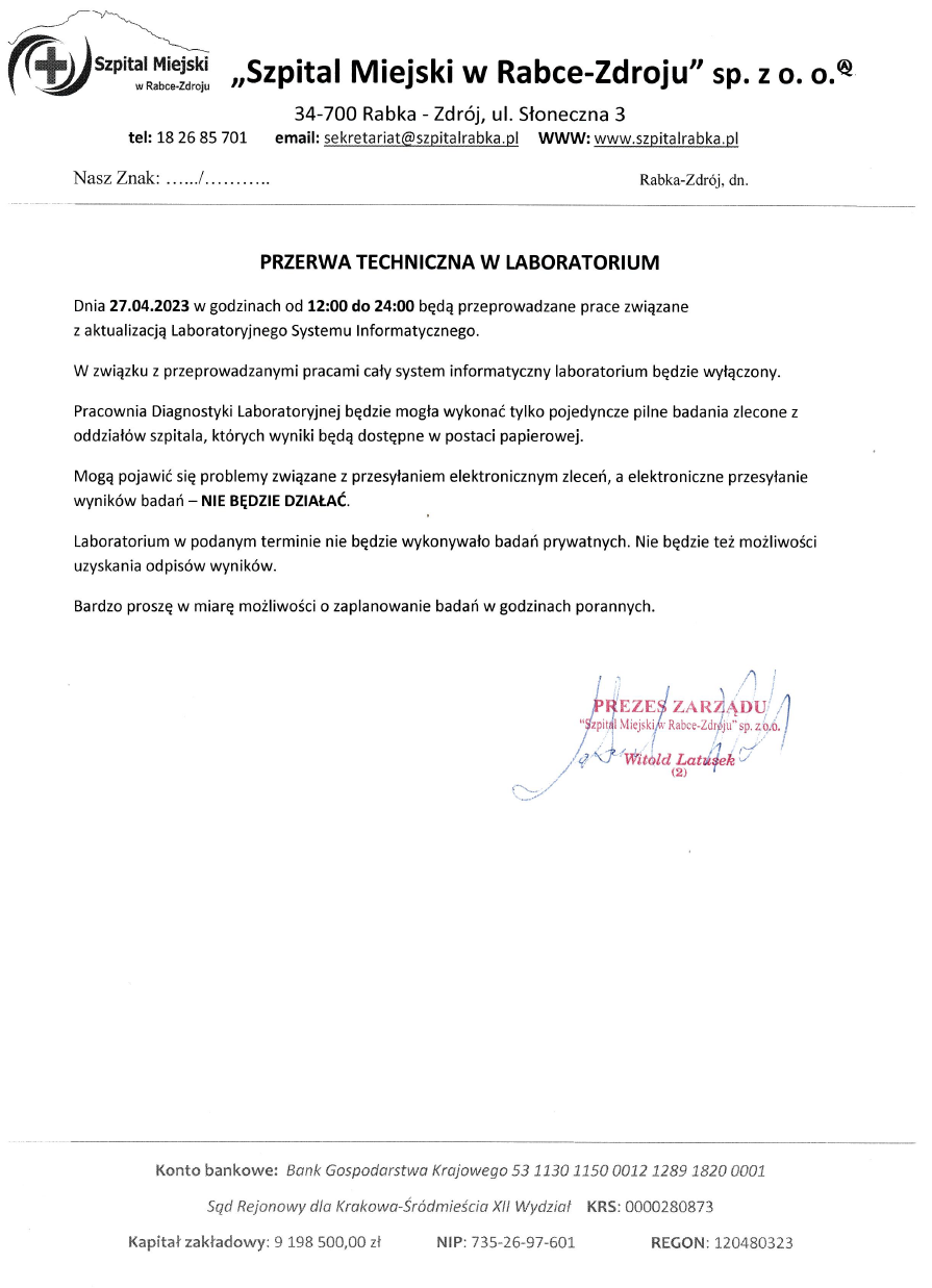 Ze względu na brak zainteresowania testami SARS-CoV-2 metodą RT-PCR – od 06.04.2022 Szpital Miejski w Rabce-Zdroju zawiesza ich wykonywanie.