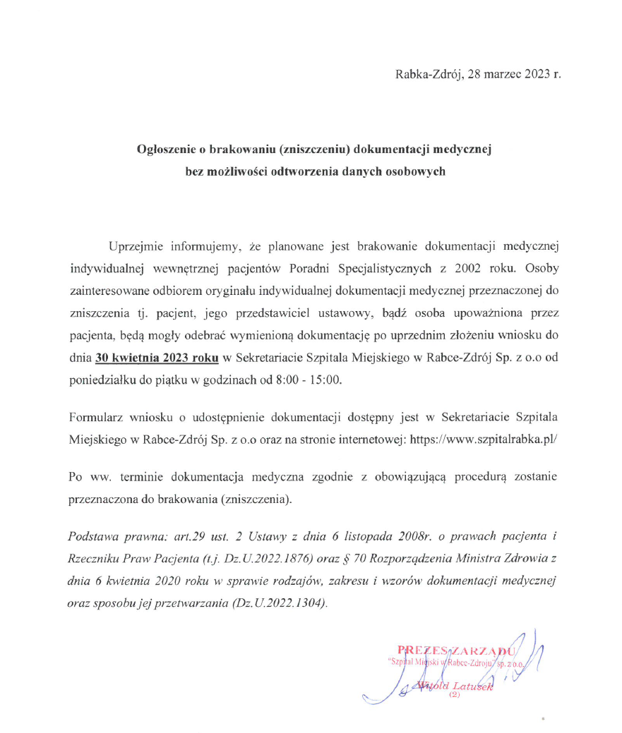 Osoby zainteresowane odbiorem oryginału indywidualnej dokumentacji medycznej przeznaczonej do zniszczenia tj. pacjent, jego przedstawiciel ustawowy, bądź osoba upoważniona przez pacjenta, będą mogły odebrać wymienioną dokumentację po uprzednim złożeniu wniosku do dnia 18 lutego 2022 roku w Sekretariacie Szpitala Miejskiego w Rabce-Zdrój Sp. z o.o. od poniedziałku do piątku w godzinach od 8:00-15:00.